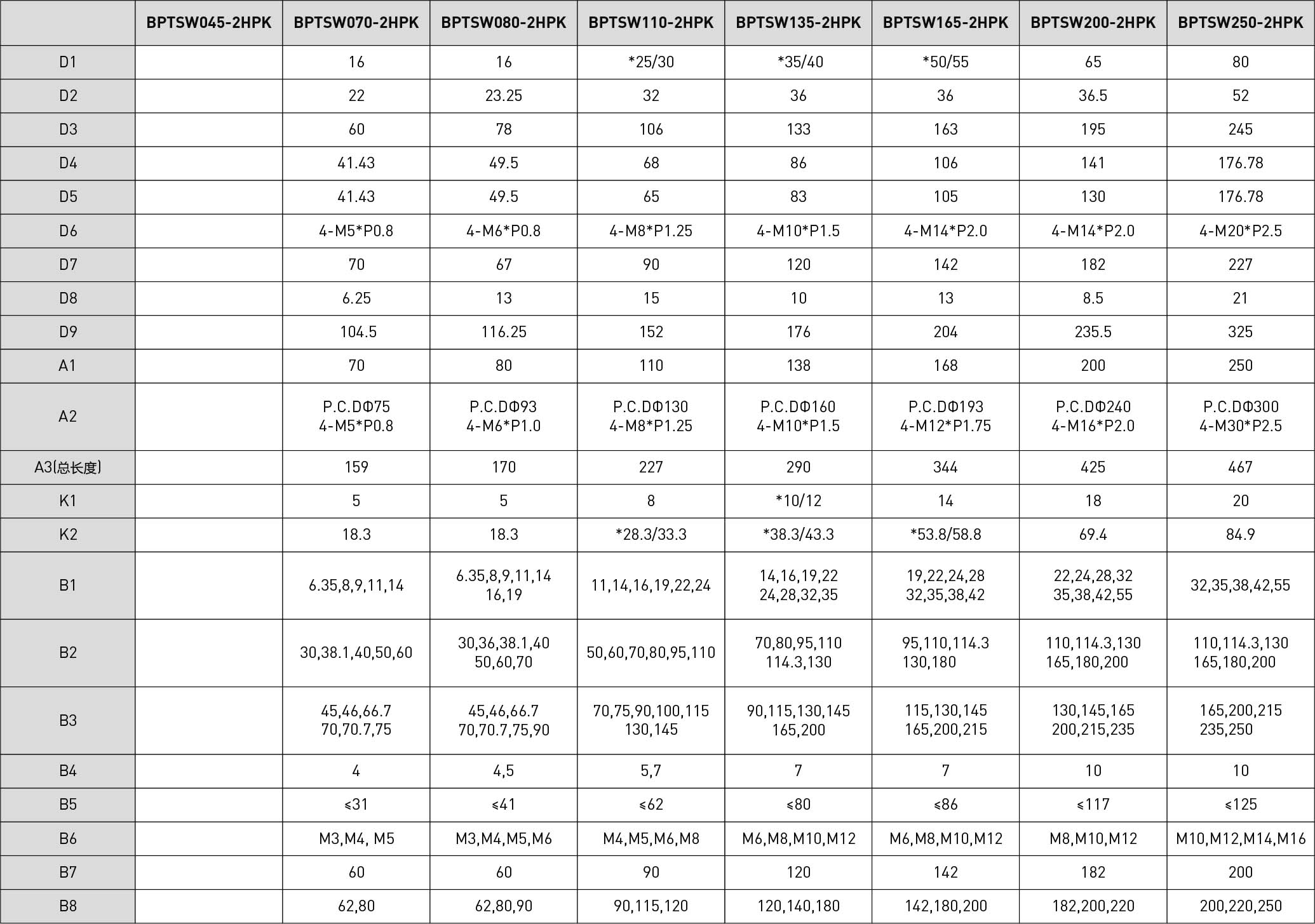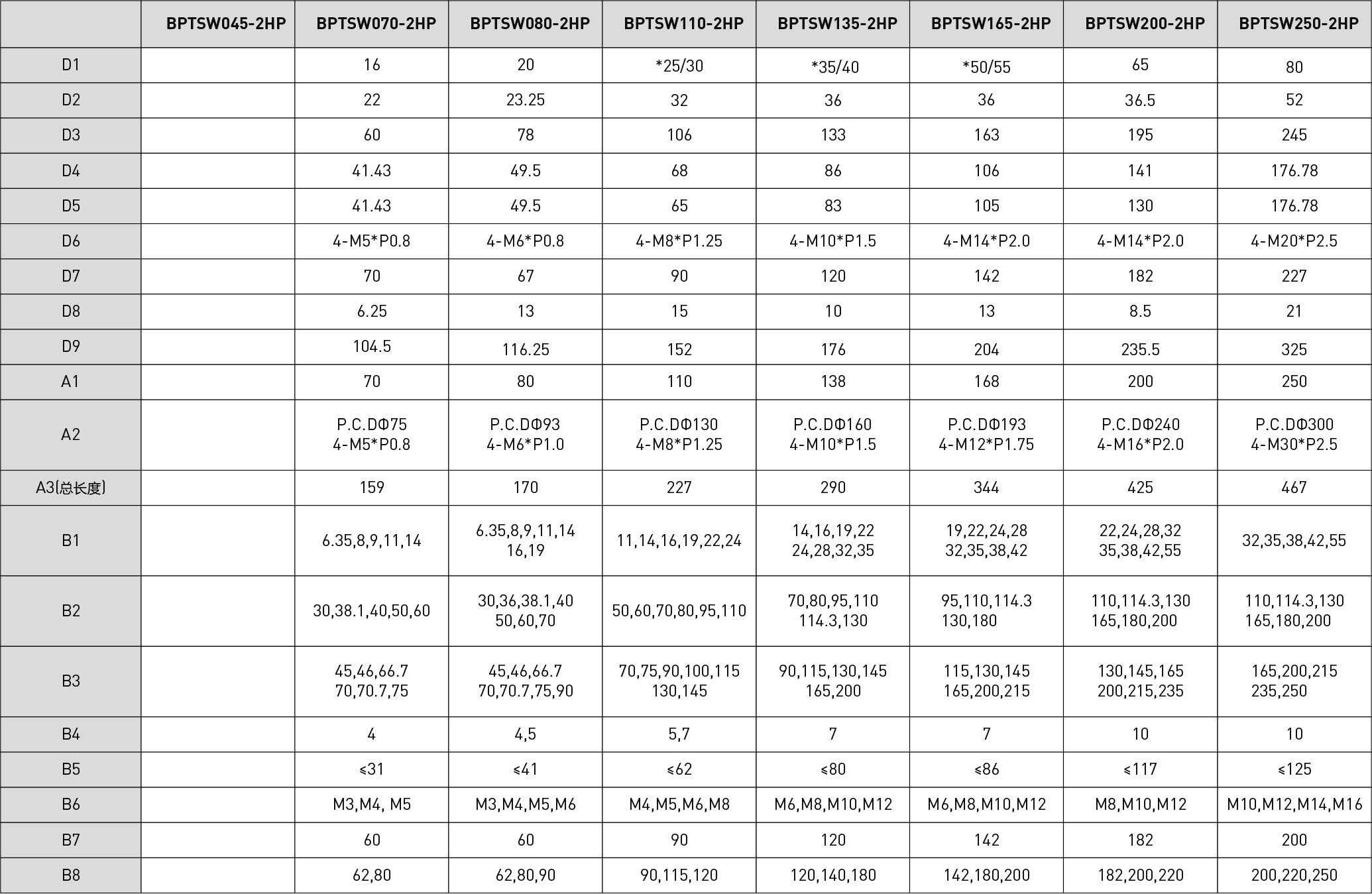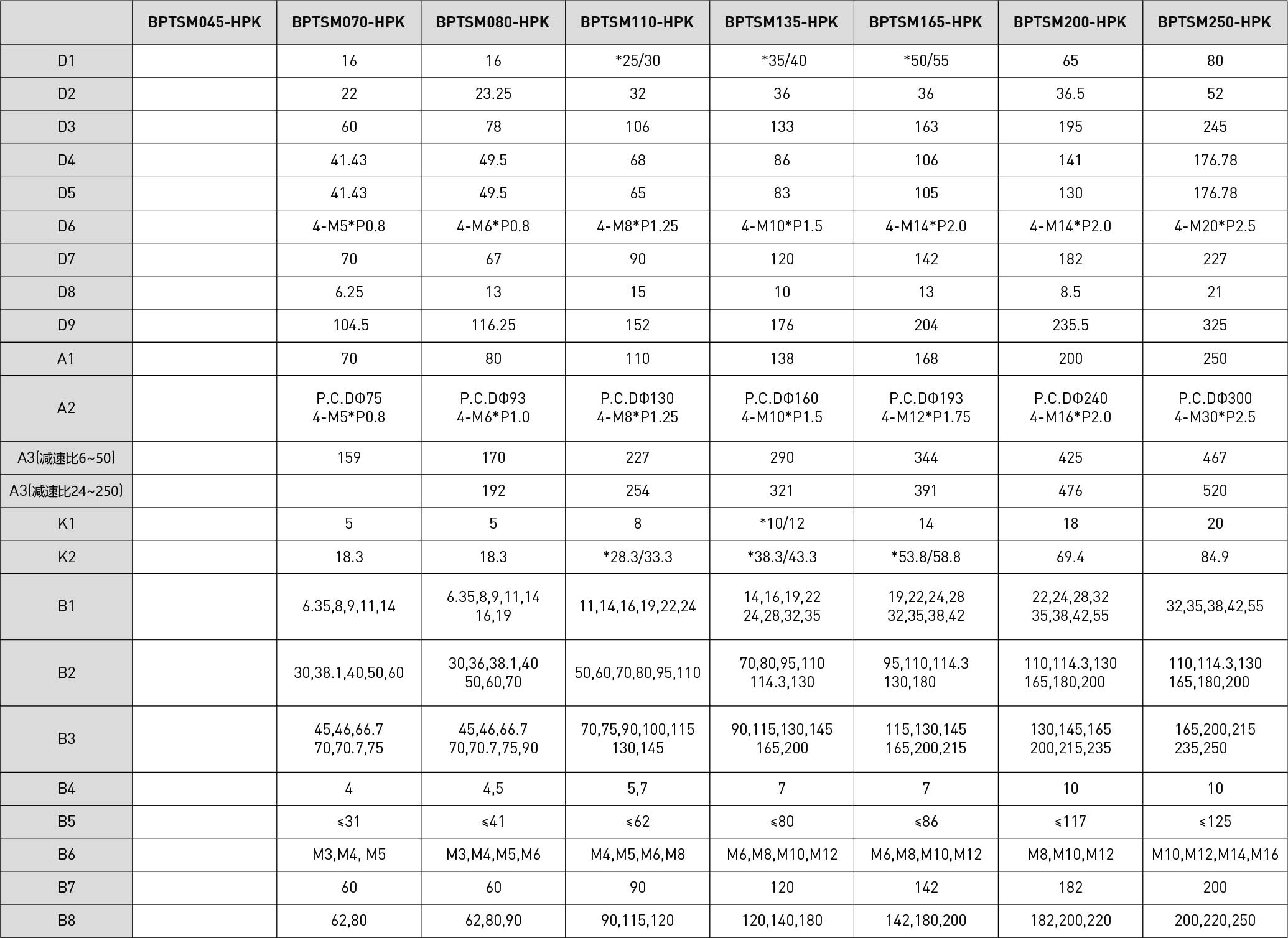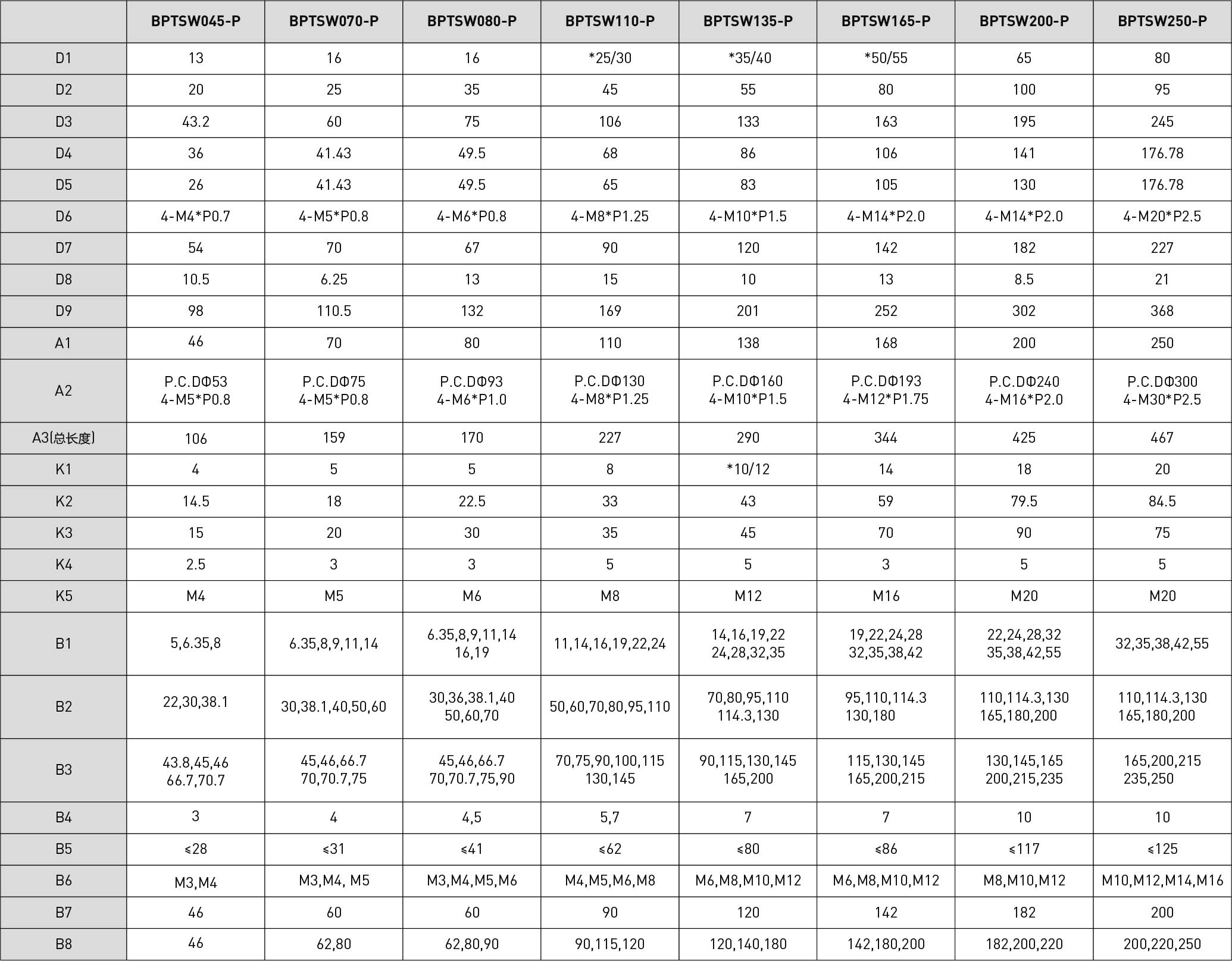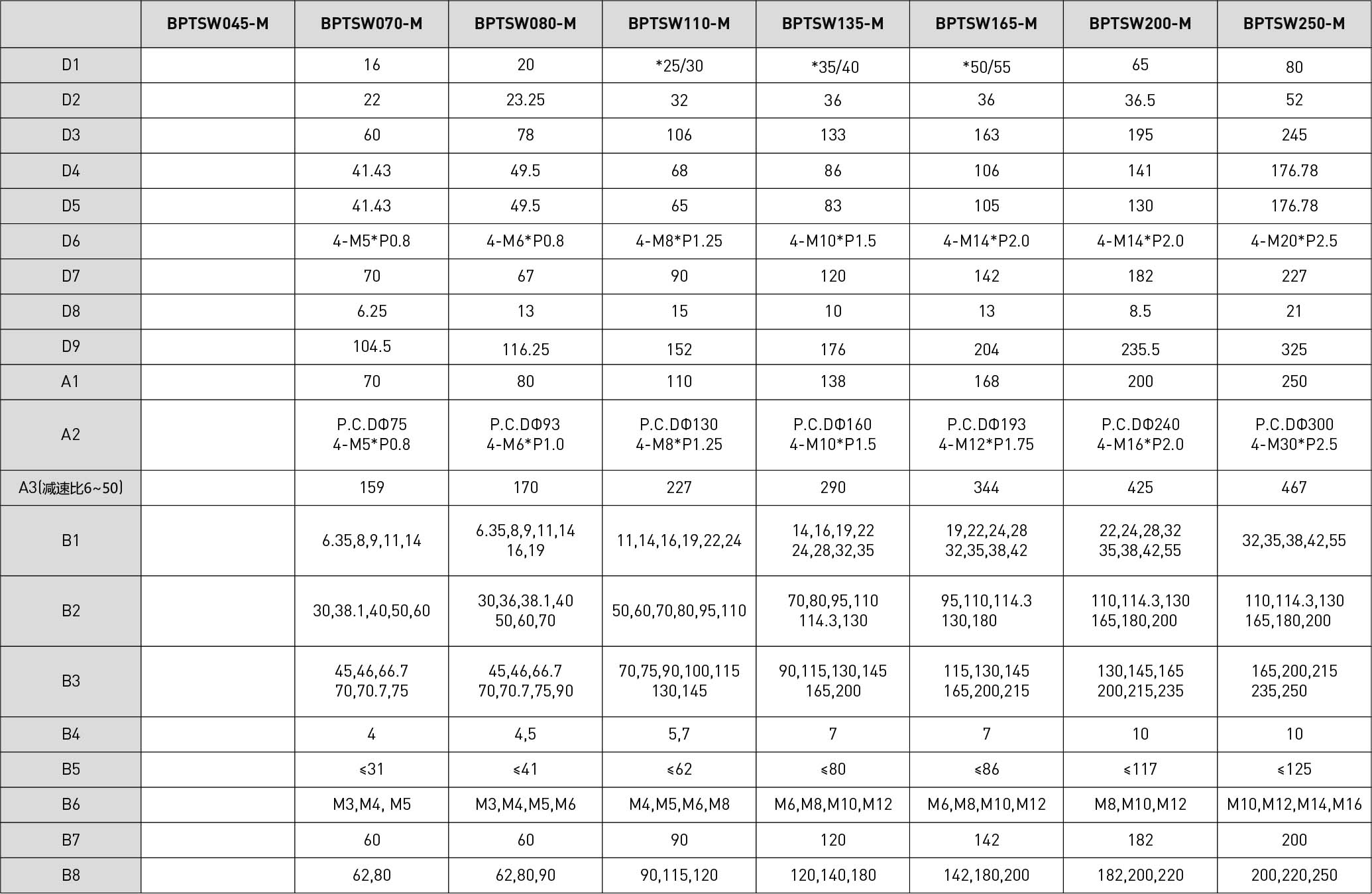 | 技术参数 | 单位 | 减速比 | BPTSW045 | BPTSW070 | BPTSW080 | BPTSW110 | BPTSW135 | BPTSW165 | BPTSW200 | BPTSW250 |