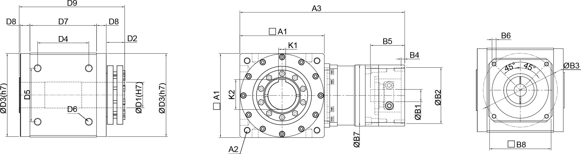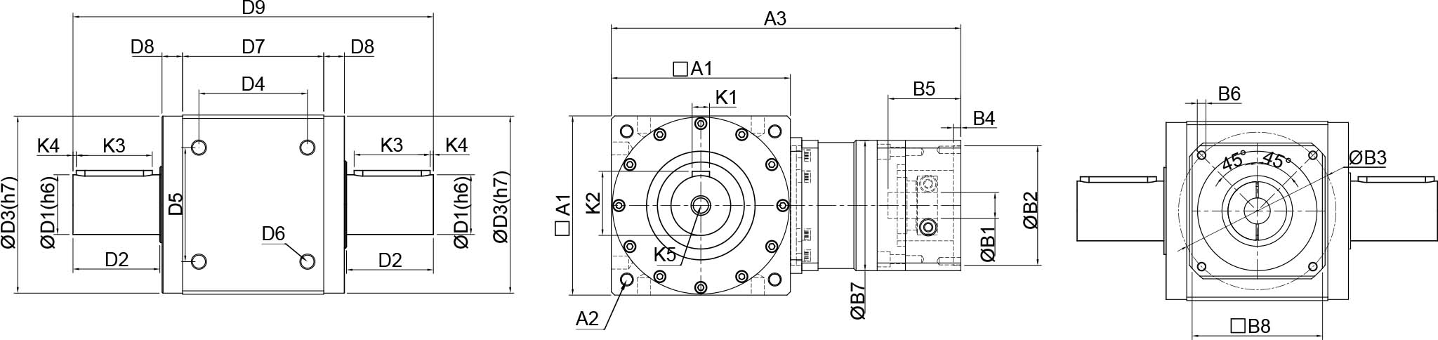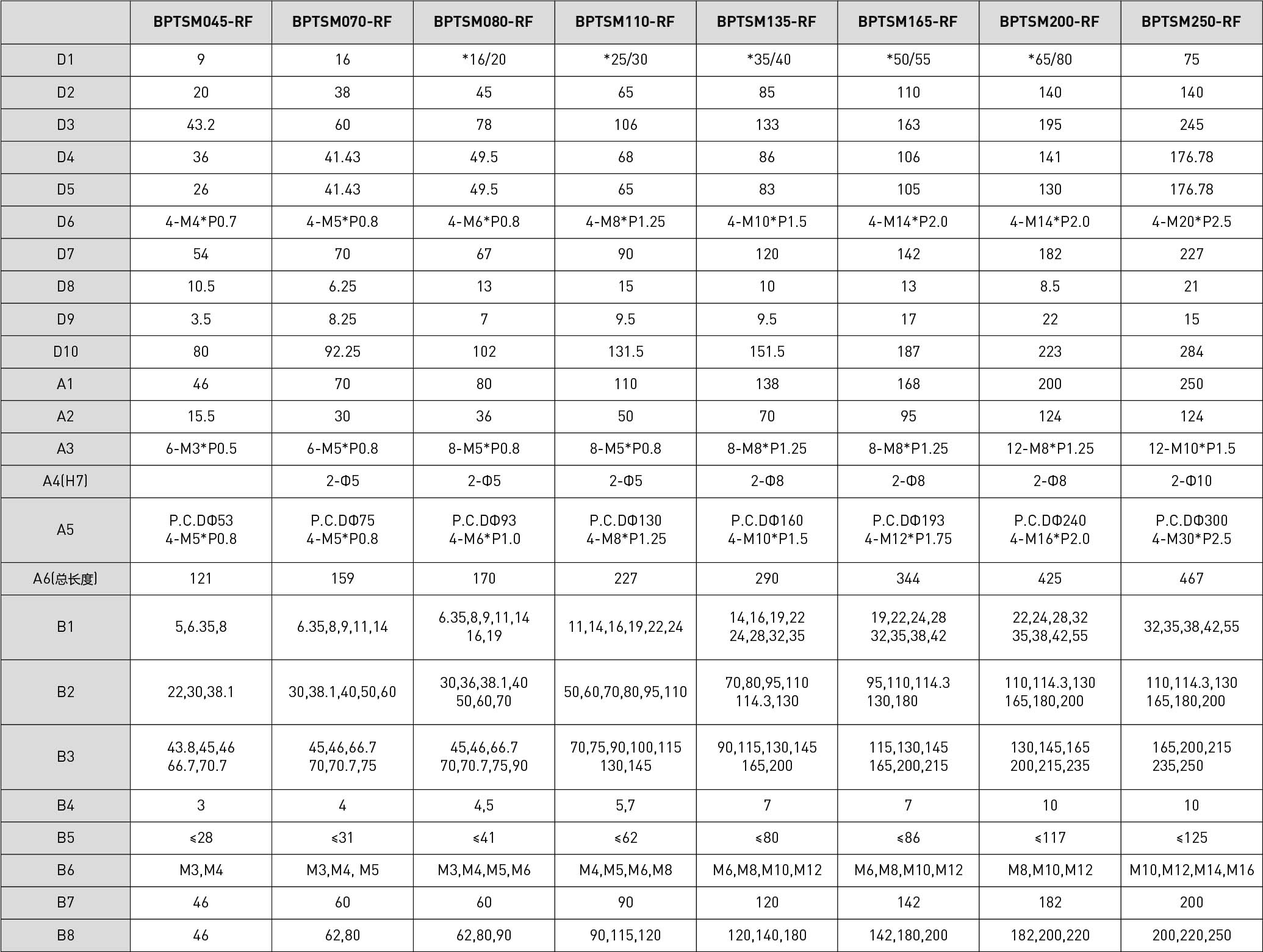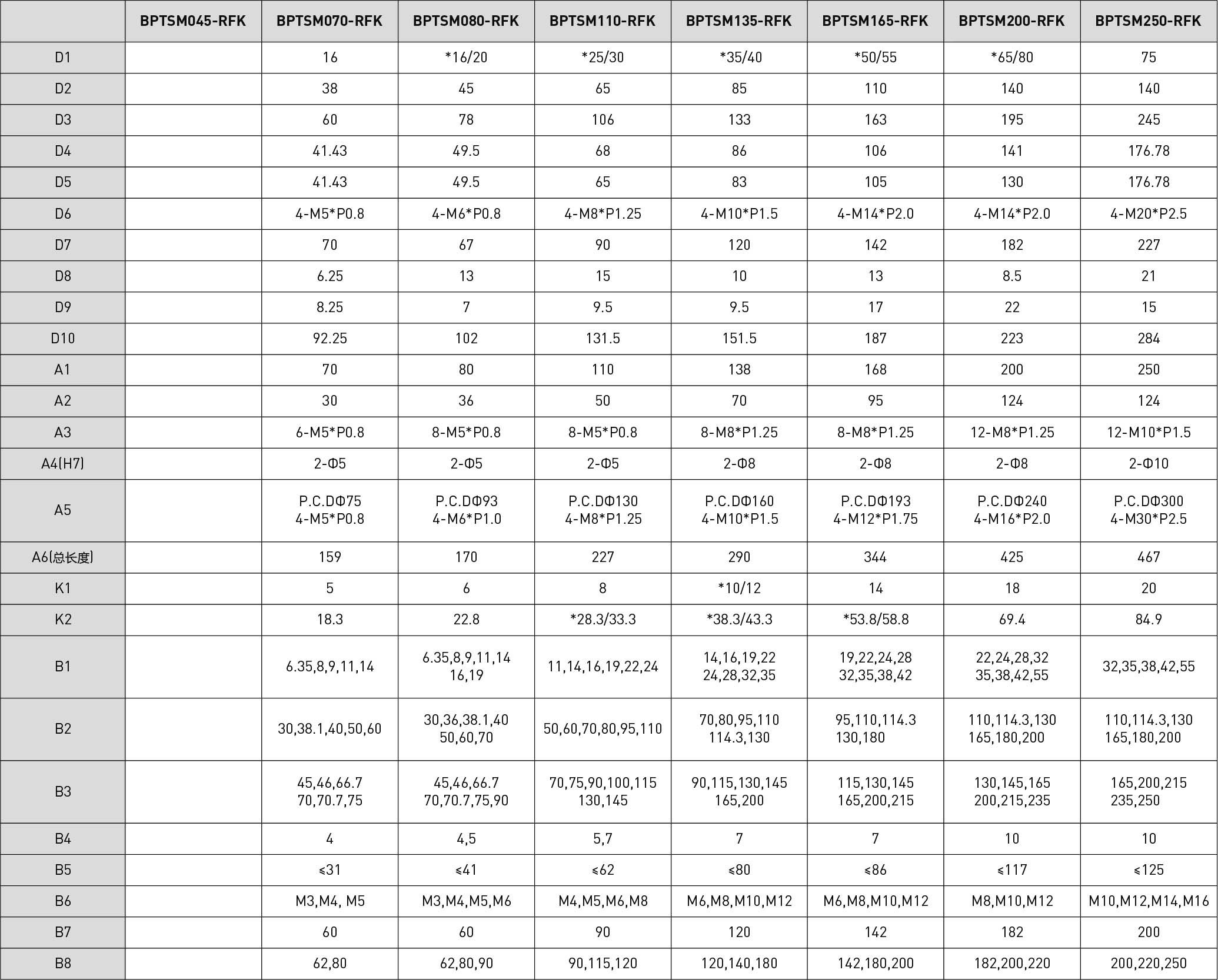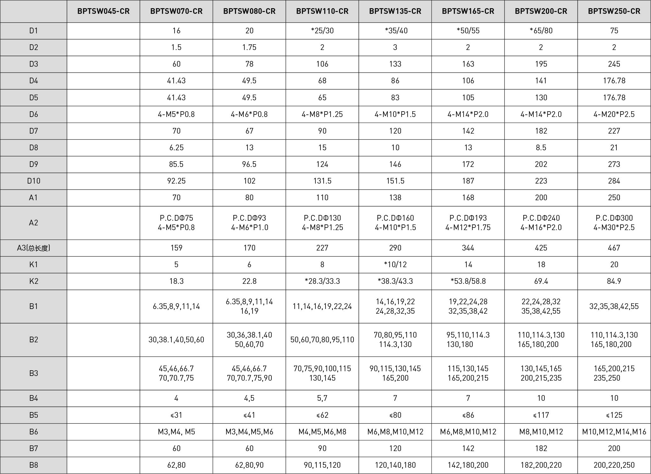 | 技术参数 | 单位 | 减速比 | BPTSW045 | BPTSW070 | BPTSW080 | BPTSW110 | BPTSW135 | BPTSW165 | BPTSW200 | BPTSW250 |