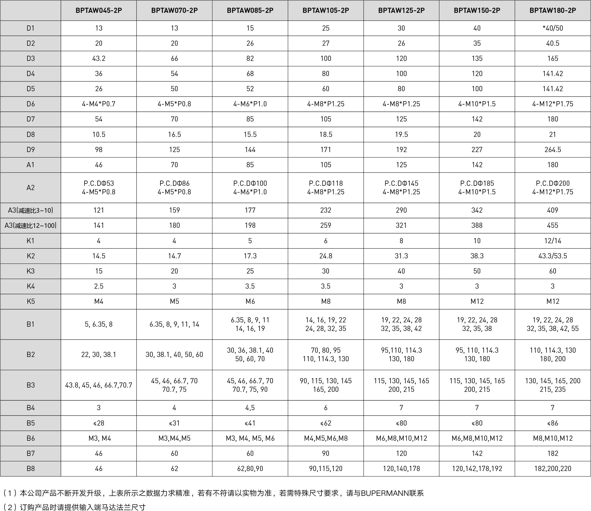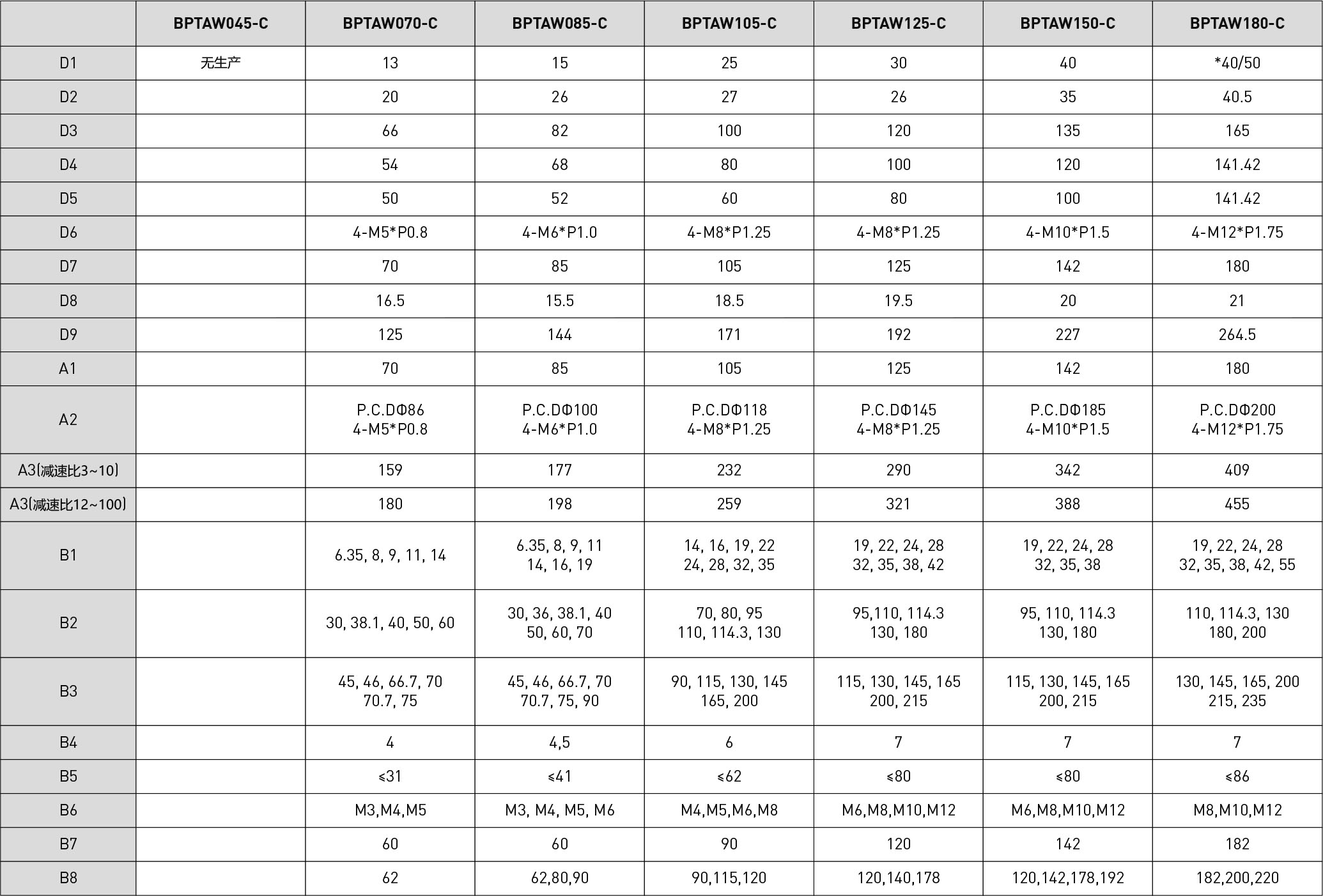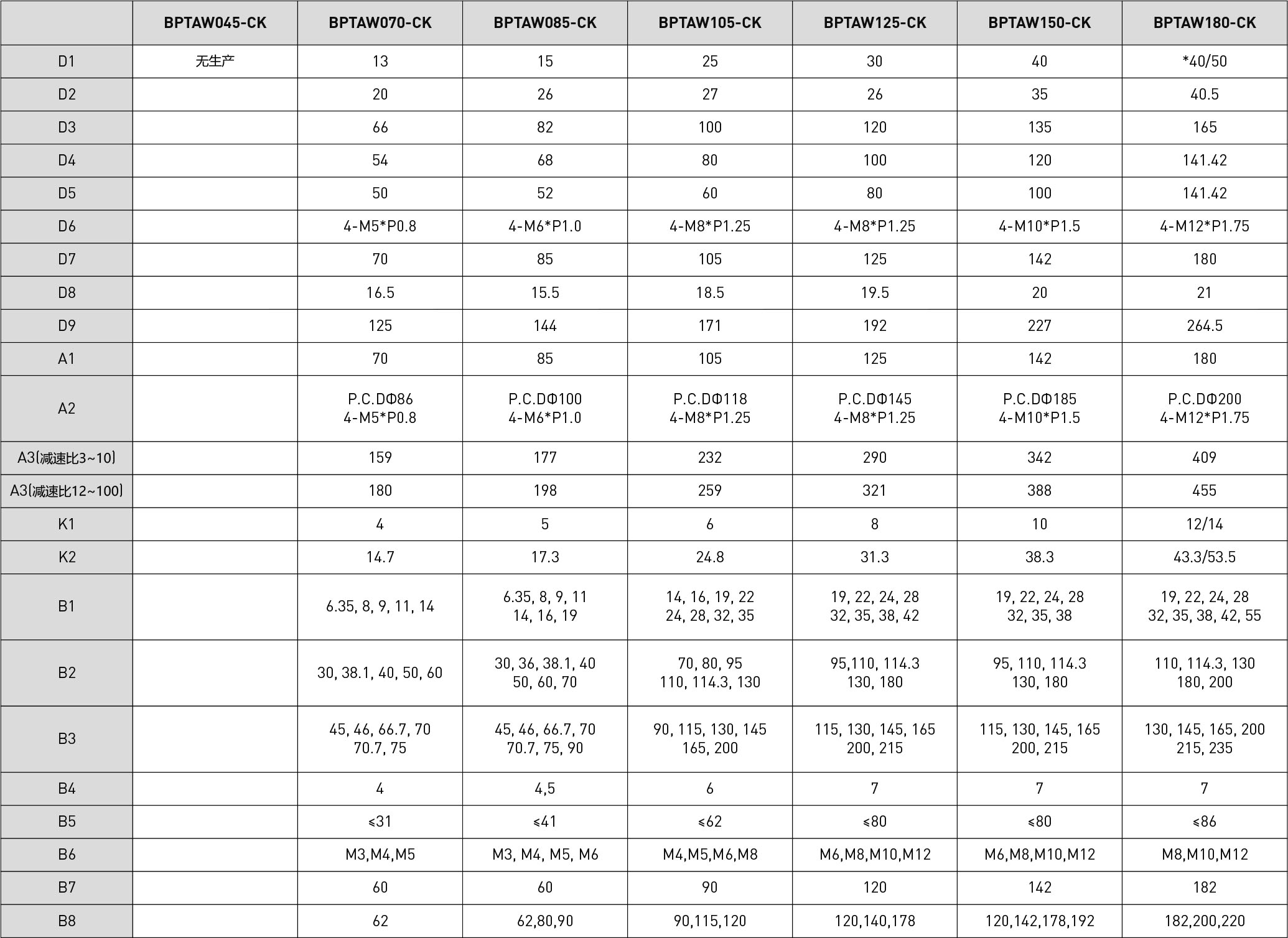 | 技术参数 | 段数 | 减速比 | BPTAW045 | BPTAW070 | BPTAW085 | BPTAW105 | BPTAW125 | BPTAW150 | BPTAW180 |